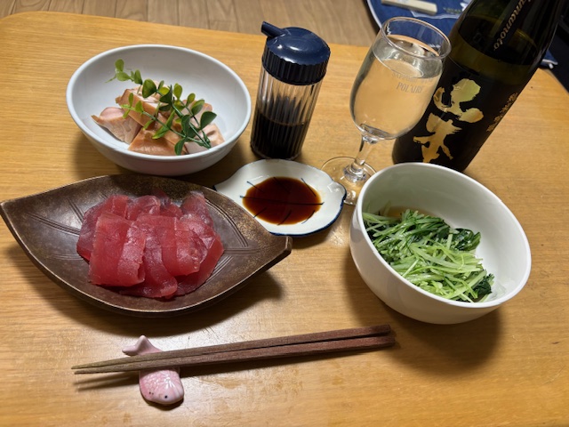 馴染みの魚屋さんで、解体したばかりという「キハダマグロ」を柵で買い、自分で引いて、刺身にし、アテにしました。